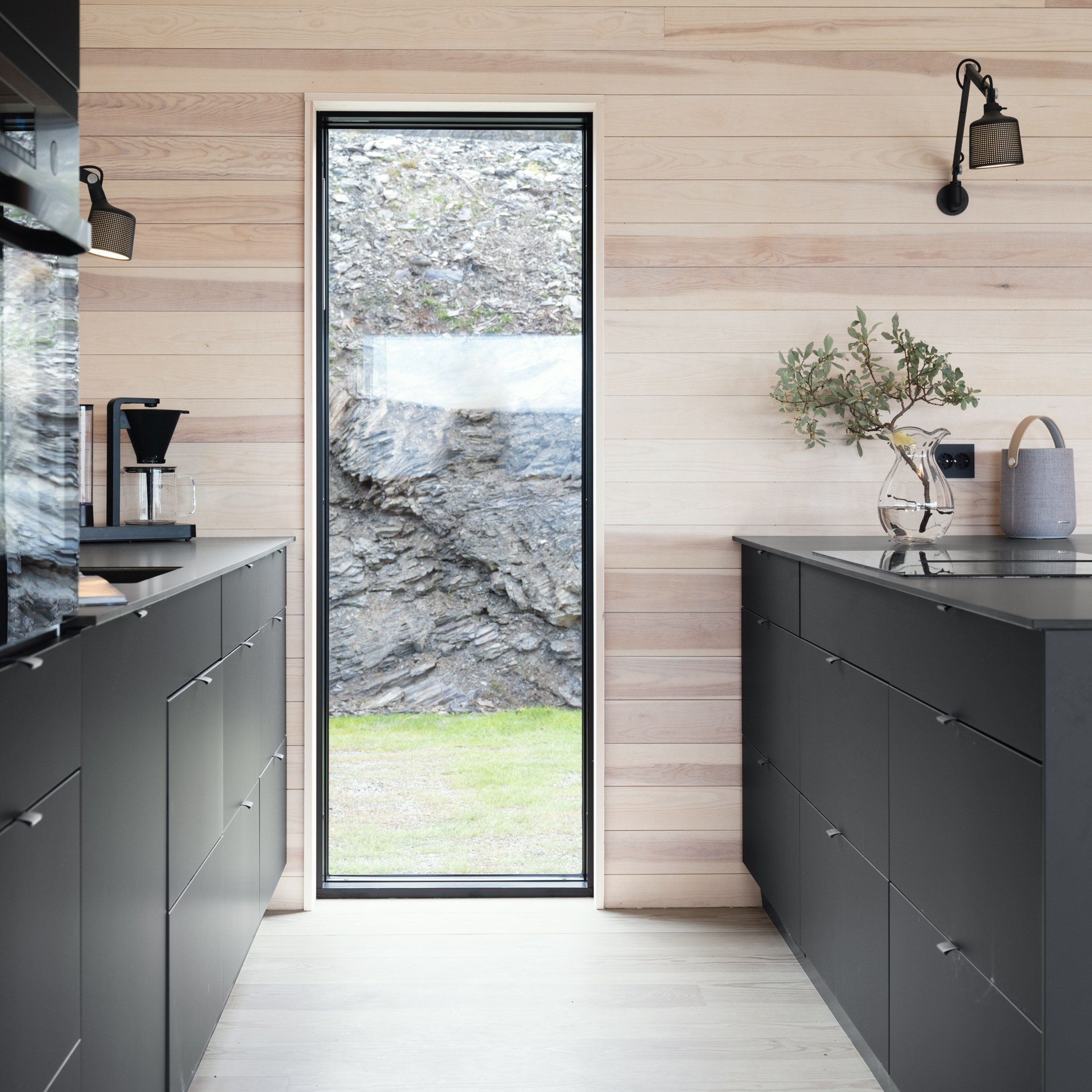 Ingenting er overlatt til tilfeldighetene når det gjelder materialvalg i våre hytter. For å oppnå de sømløse, listefrie overgangene leverer vi massive, slette innerdører med spesialdybde på karm som tilsvarer veggtykkelsen. Alle våre vinduer og dører leveres ferdig malt i en dyp, grå farge – og de mørke detaljene bidrar til å gi våre hytter det moderne, stilrene uttrykket vi etterstreber.